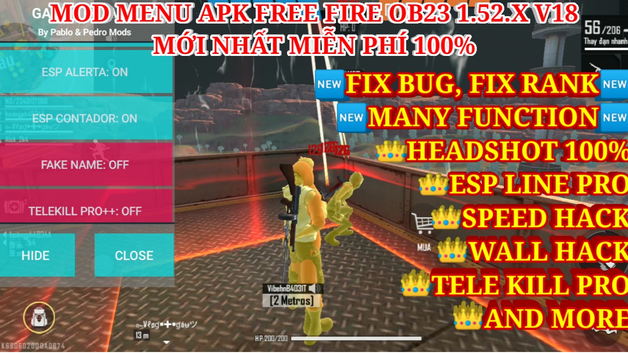 Thông tin: MOD MENU APK FREE FIRE OB23 1.52.X V18 FREE - FIX BUG, FIX RANK, HEAD SHOT 100%, TELEKILL, ESP LINE.